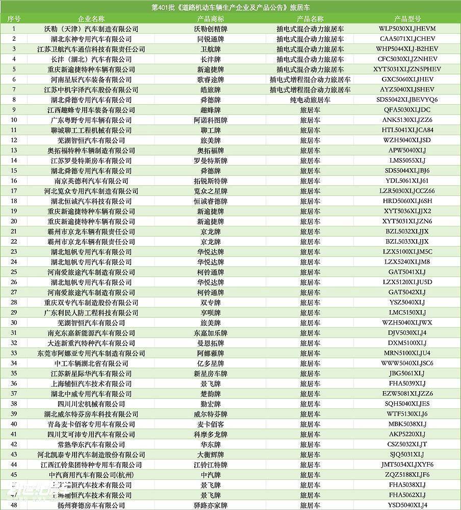 【21RV 工信部】2025年11月10日,工业和信息化部在第401批《道路机动车辆生产企业及产品公告》中,公示了旅居车与宿营车类别共78款新产品。其中,旅居车产品52款,包括48款自行式房车和4款旅居挂车;宿营车产品26款。